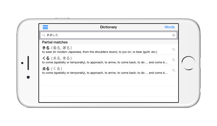 App allows to search for conjugated words, for example entering きました will still find the base words, such as 来る and 着る.